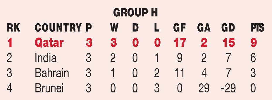 India finished second in the group with six points from two wins, but despite defeating Brunei 6-0 in the earlier match, failed to advance after finishing fifth among the group runners -up.