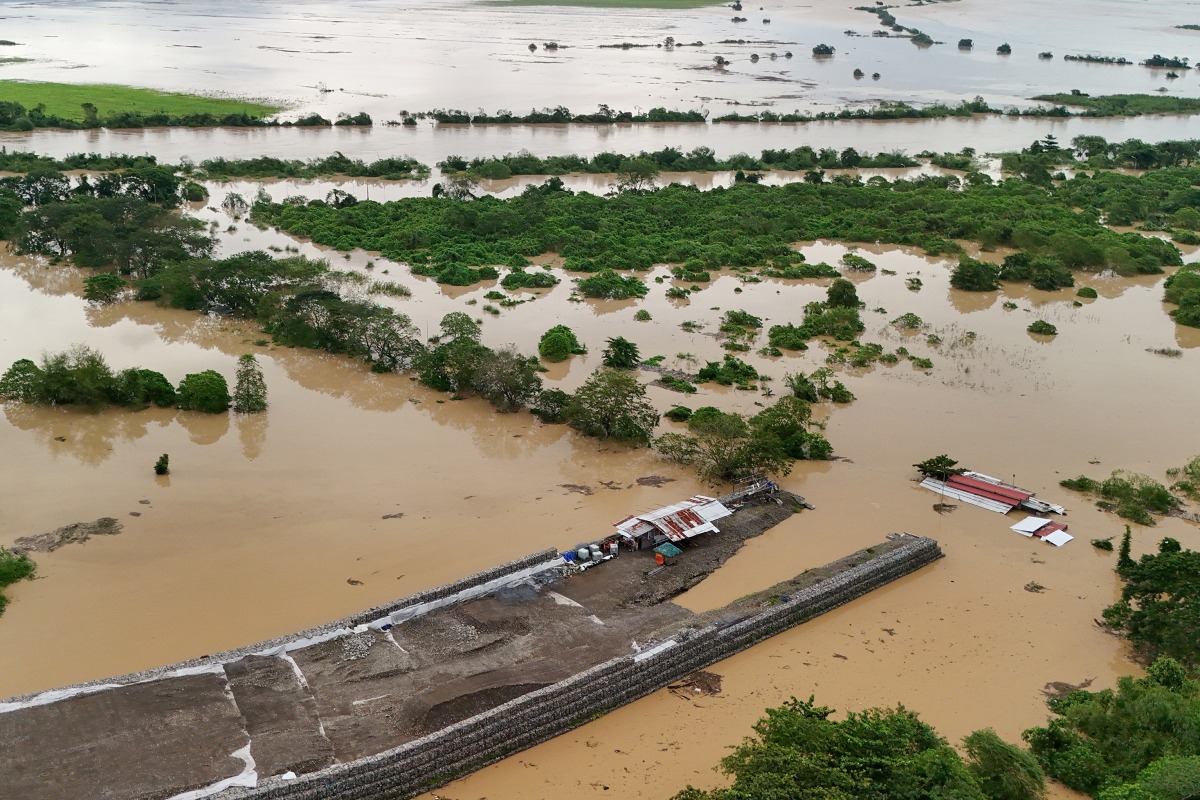 This photo shows an aerial view of flooded houses in Tuguegarao City, Cagayan province, north of Manila on November 10, 2025, after a river overflowed following heavy rains brought about by Super Typhoon Fung-wong. Photo by JOHN DIMAIN / AFP