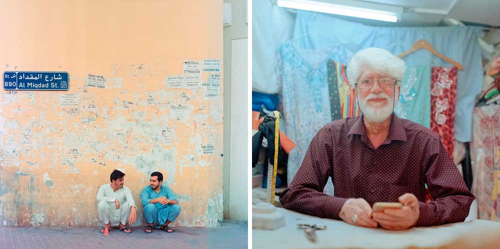 In a mix of black-and-white and vibrant hues, his photographs depict residents from different walks of life. Captured at a specific point in time, his collection includes a male worker looking toward the horizon as the golden rays of sunset illuminate his face and his sandy orange uniform; two men in pathani suits sit on a beige leather couch among scattered sandals; grey-haired tailor smiles at the camera as women’s clothing fill the background; two friends engrossed in a conversation were pictured crouching on the street beside a road sign.