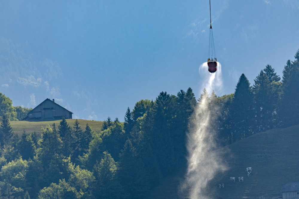 A Swiss Air Force Super Puma helicopter picks up water from the Montsalvens lake for cows in a mountain pasture amid an ongoing drought in Broc, Switzerland, August 10, 2022. (REUTERS/Denis Balibouse)
