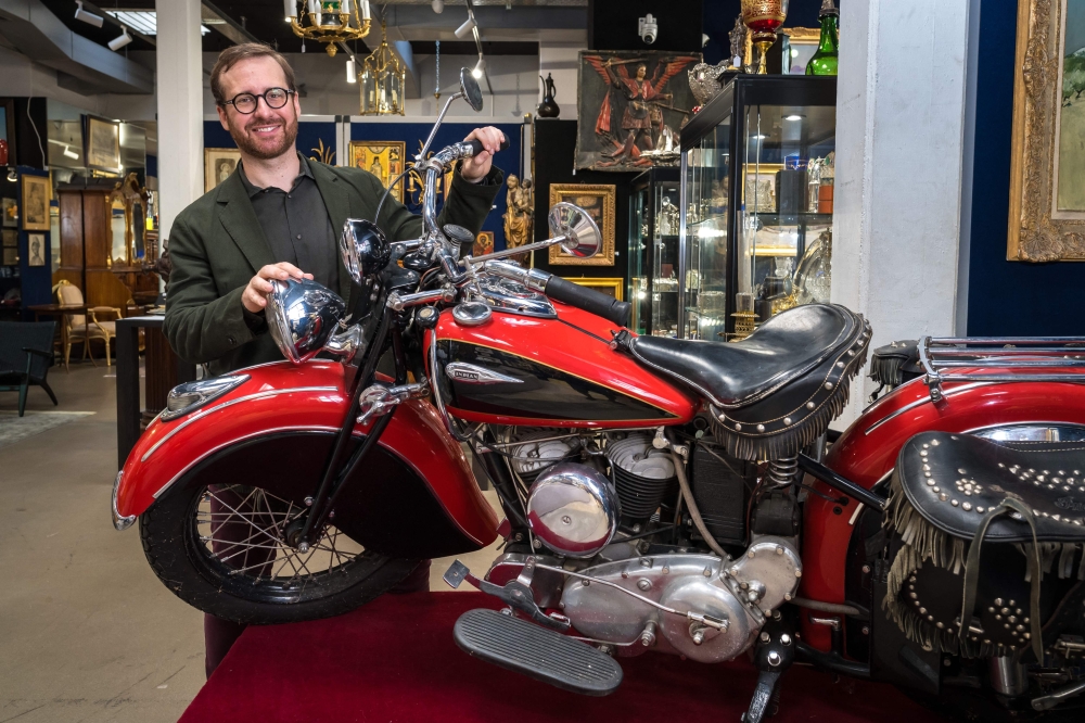 Geneve Encheres auction house's Cyril Duval poses with an Indian Sport Scout 750cc motorcycle on September 8, 2023. (Photo by Fabrice Coffrini / AFP)