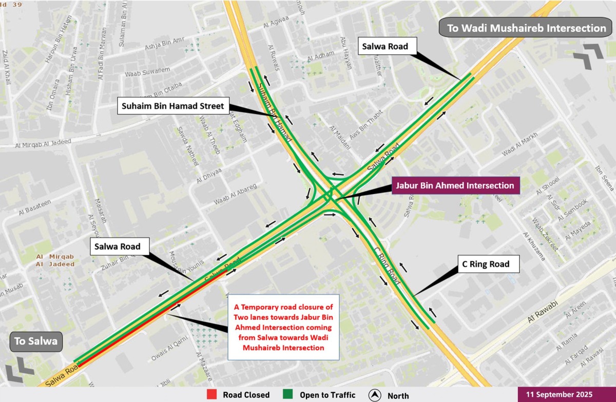 Two lanes near Jabur Bin Ahmed Intersection coming from Salwa towards Wadi Mushaireb Intersection will be closed from 2am on Friday, September 12, 2025, until 7am on Saturday, September 13, 2025.