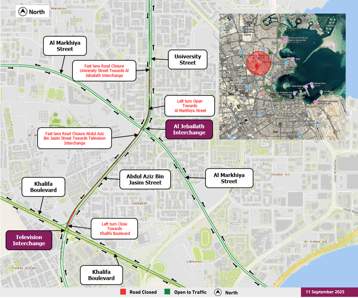 A single lane and left turn lane coming from Lejbailat Interchange towards Onaiza Interchange on Al Markhiya Street will be closed from 2am on Friday, September 12, 2025, until 7am on Saturday, September 13, 2025. During this period, traffic will be redirected towards Lekhwair Interchange as indicated in the map.