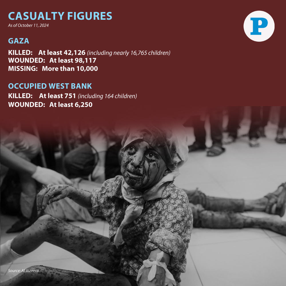 The Palestinian Ministry of Health in Gaza announced that the death toll from the ongoing Israeli aggression on the Gaza Strip since October 2023 has surged to 42,126 martyrs, in addition 98,117 injuries as of today, October 11.