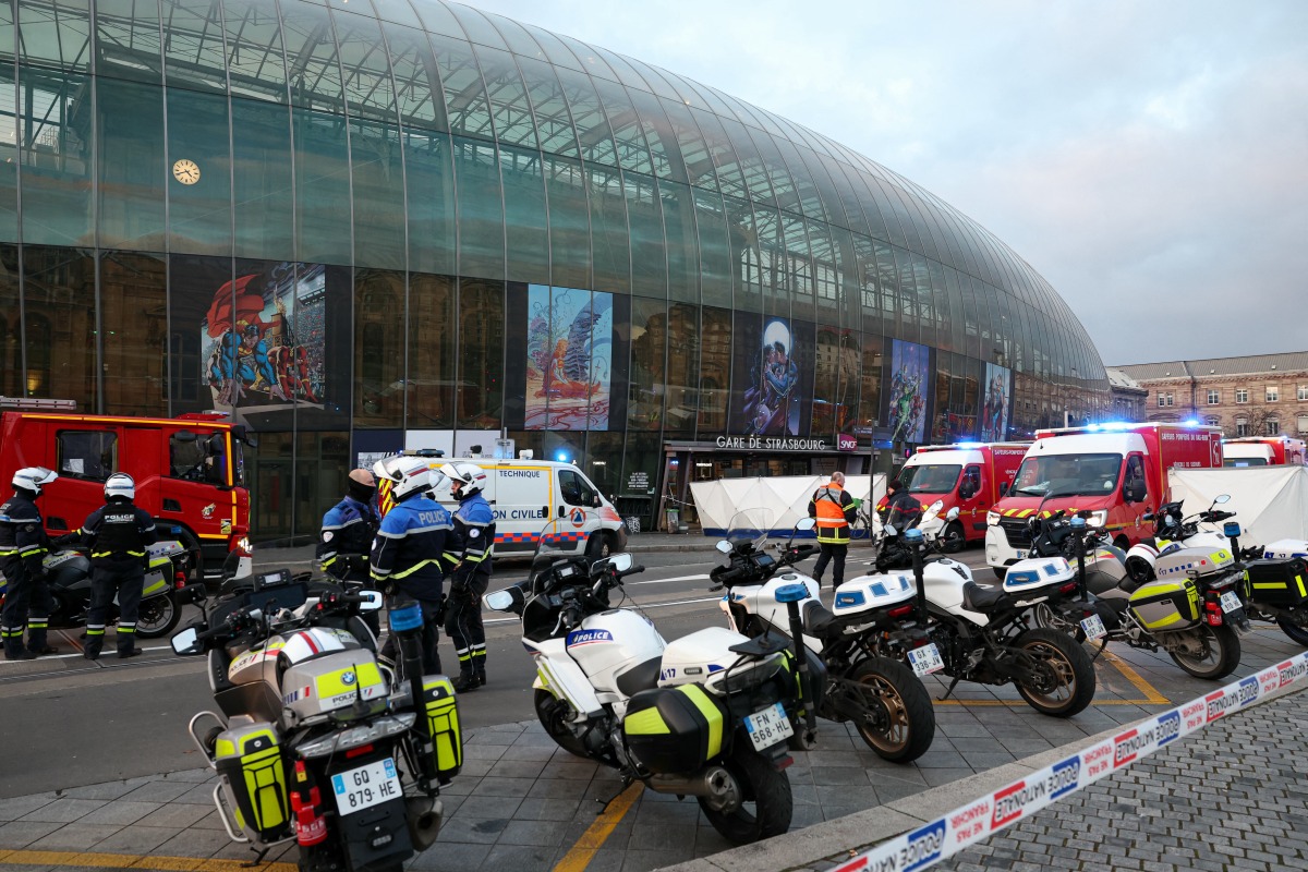 French police officers stand outside the Strasbourg railway station following a collision of two trams, in Strasbourg, eastern France, on January 11, 2025. Photo by FREDERICK FLORIN / AFP