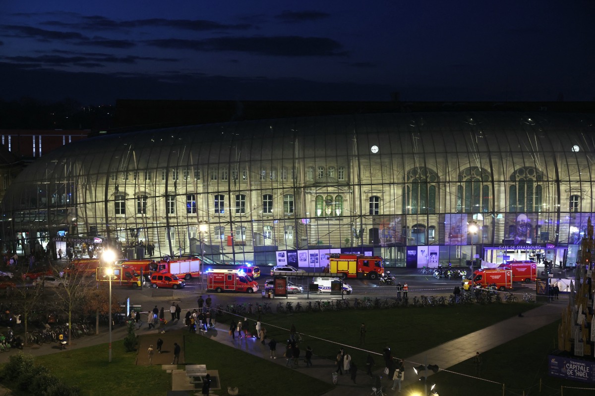 Firefighters' and rescue vehicles stationed outside the Strasbourg railway station following a collision of two trams, in Strasbourg, eastern France, on January 11, 2025. Photo by Frederick Florin / AFP