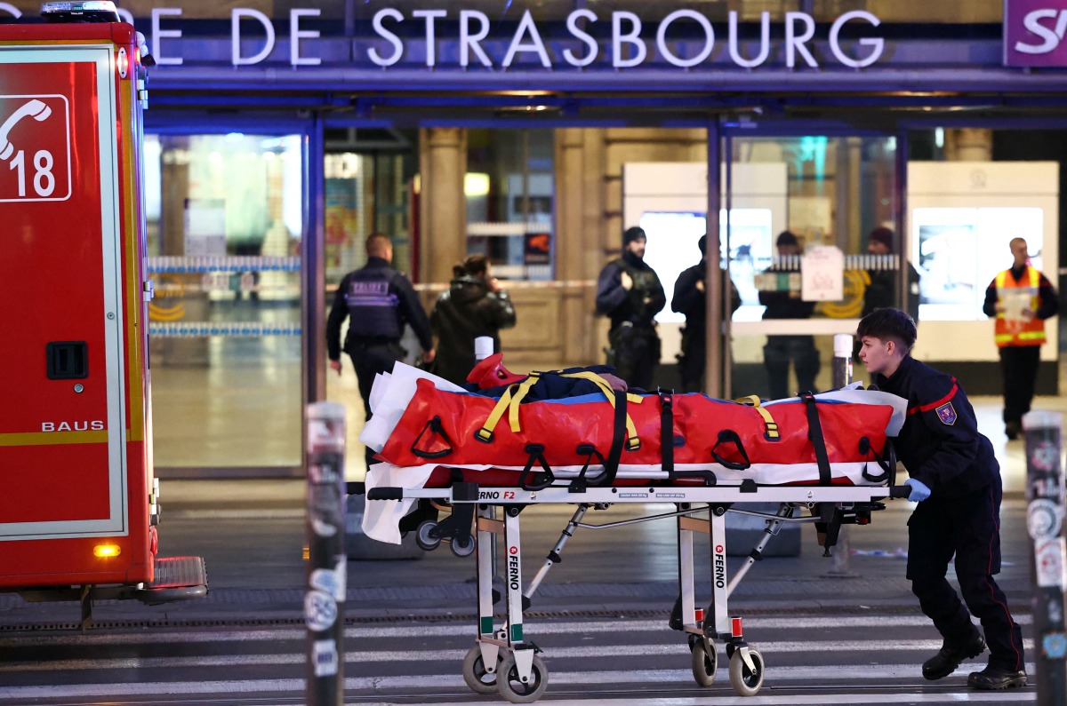 A firefighter carries an injured person on a strechter outside the Strasbourg railway station after a collision of two trams, in Strasbourg, on January 11, 2025. Photo by Frederick Florin / AFP