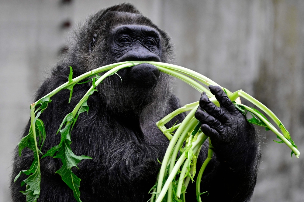 Fatou, known to be the world's oldest female gorilla, feeds on a vegetable she picked out of a basket that was placed in her outdoor enclosure one day ahead of her 67th birthday at the Berlin Zoological Gardens, Berlin, Germany, on April 12, 2024. (Photo by John MacDougall / AFP)