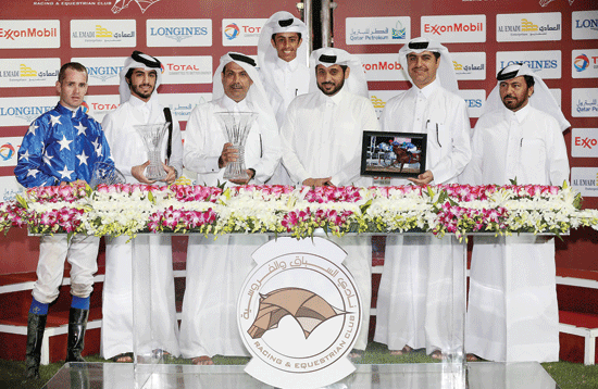 Trainer Jassim Al Ghazali, celebrates after Qassy, with jockey JP Guillambert (left) in the saddle, won the Al Daayen Cup, the feature race at Qatar Racing and Equestrian Club (QREC), in Doha yesterday. Meghwaar, ridden by Richard Mullen, and Ashkal finished in second and third spots respectively. Today’s action starts at 4:00pm.