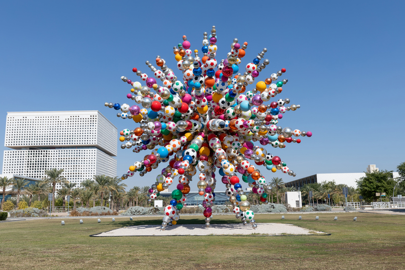 Come Together, a public art installation designed by South Korean artist Choi Jeong Hwa, pays tribute to Qatar’s preparations for the FIFA World Cup Qatar 2022™. The structure, resembling a dandelion, is made up of workers’ helmets, mirror balls, and traditional Qatari kitchenware.
