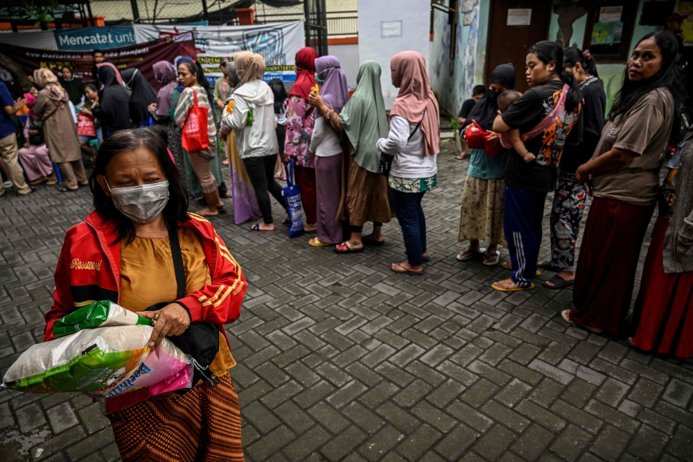 People queue in line to buy basic daily necessities at a cheap market event held by the government in Surabaya to maintain stable food supplies and prices on March 12, 2024. (Photo by Juni Kriswanto / AFP)