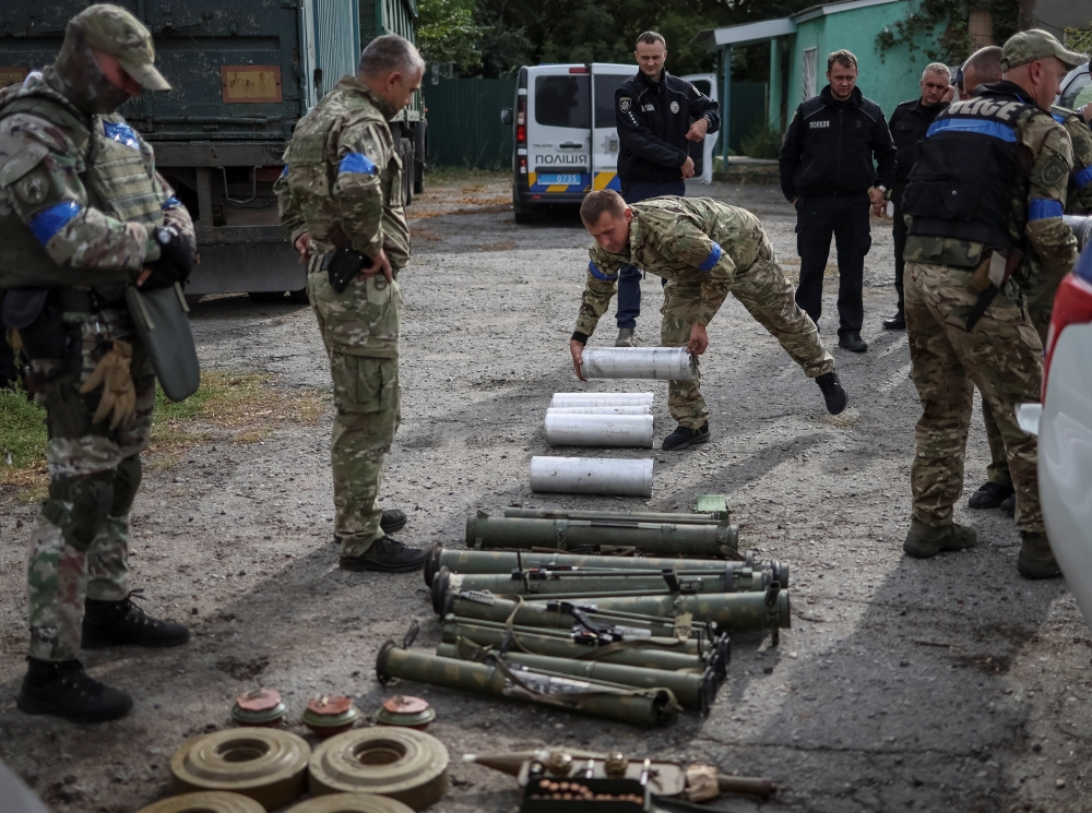 A police sapper carries a cassette with anti-personnel mines POM-3 after return from the village of Udy, recently liberated by Ukrainian Armed Forces, in the town of Zolochiv, Kharkiv region, Ukraine, on September 12, 2022. (REUTERS/Gleb Garanich)