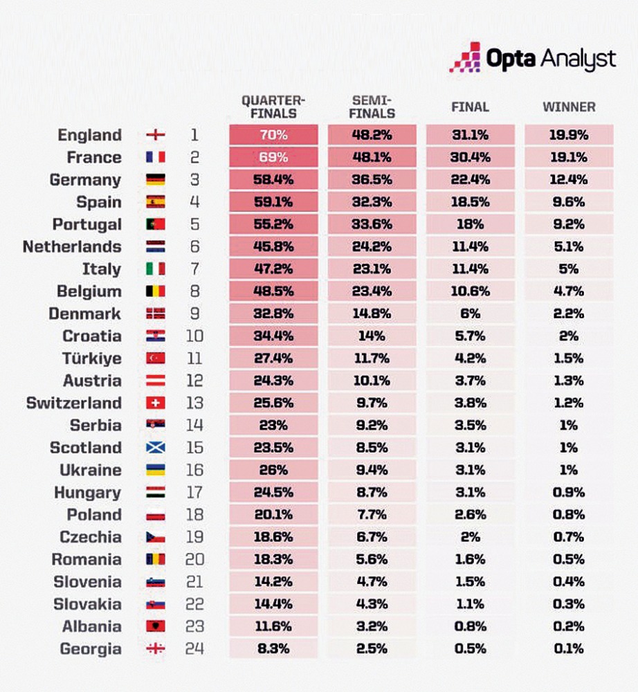 Opta calculations suggest that each team has a great chance of getting through different phases of this year’s Euros. England lead the list with a 70% chance to make it at least to the quarter-finals, a 48.2 % probability of reaching the semis, and a 31.1% likelihood of appearing in the Berlin finale.