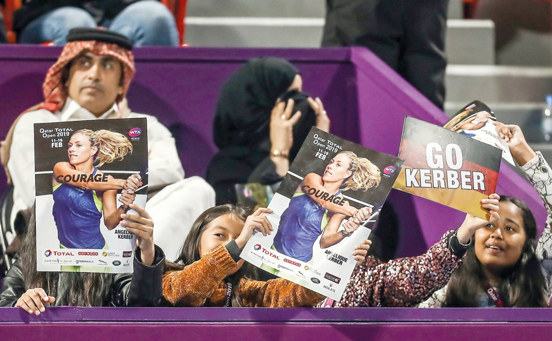 Fans of Angelique Kerber cheer for her with posters during her quarter-final match against Barbora Strycova, yesterday.