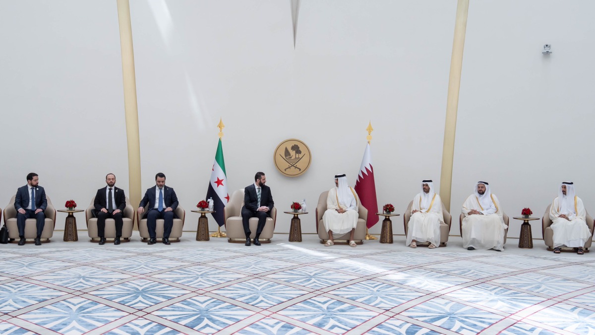 Doha, Qatar: The Amir HH Sheikh Tamim bin Hamad Al Thani led the well-wishers to welcome President of the Syrian Arab Republic HE Ahmed Al Sharaa and the accompanying delegation upon their arrival at the Amiri Terminal at Hamad International Airport today, April 15, 2025, on an official visit to the country.
