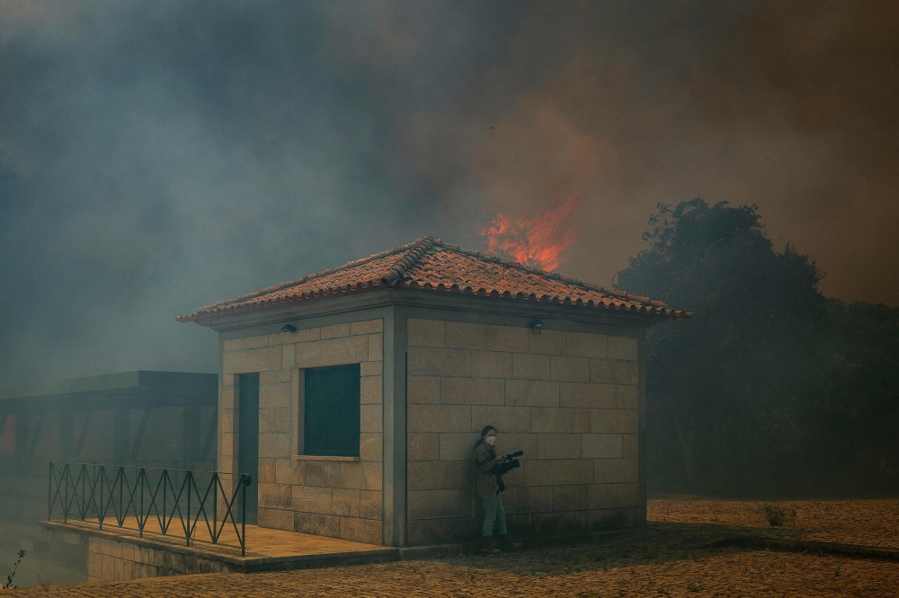 A video journalist takes cover from a wildfire in the Portuguese village of Antas, in Trancoso, on August 15, 2025. (Photo by Patricia De Melo Moreira / AFP)