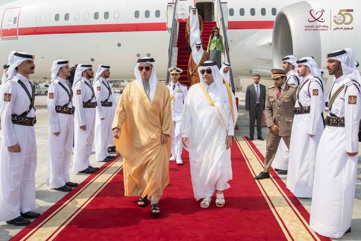 His Highness and the accompanying delegation were welcomed upon arrival at Hamad International Airport by HE Deputy Prime Minister and Minister of State for Defense Affairs Sheikh Saoud bin Abdulrahman bin Hassan Al-Thani and Charge d'Affaires of the Embassy of the UAE to the State of Qatar, Abdulla Al Shehhi