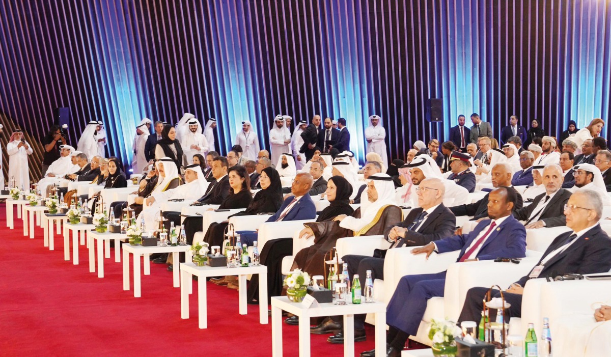 Minister of Health H E Dr Hanan Mohamed Al Kuwari (seventh right) with Minister of Environment and Climate Change H E Dr. Abdullah bin Abdulaziz bin Turki Al Subaie (tenth right), Minister of Education and Higher Education H E Buthaina bint Ali Al Jabr Al Nuaimi (fifth right) and other dignitaries at the event.