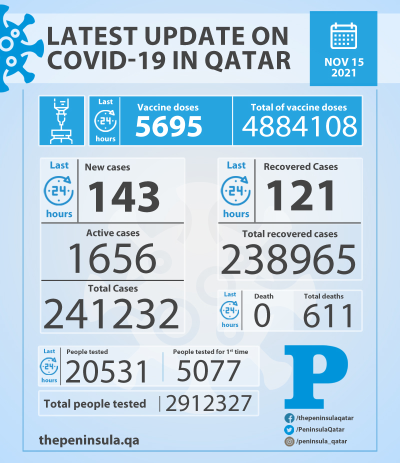 Doha: Ministry of Public Health (MoPH) today reported 143 new cases of coronavirus (COVID-19) and 121 people recovered from the virus in the last 24 hours, bringing the total number of people recovered in Qatar to 238,965.