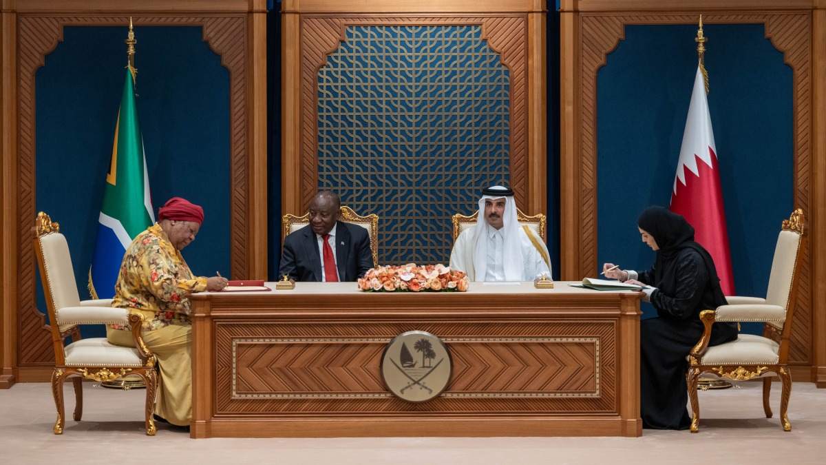HH the Amir and HE the President of South Africa witnessed the signing of several memoranda of understanding between the two governments, including a memorandum of understanding for cooperation in the field of education, a memorandum of understanding for bilateral cooperation in empowering women and persons with disabilities, and a memorandum of understanding for the establishment of a mechanism for bilateral consultations.