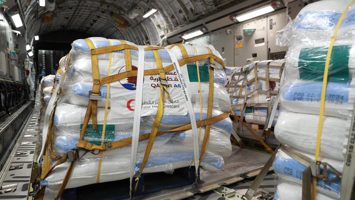 El Arish: A Qatari Armed Forces plane arrived in the city of El Arish in Egypt, carrying 30 tonnes of aid, including food supplies, provided by Qatar Red Crescent Society, bringing the total number of planes to 78, with a total of 2,334 tonnes of aid.