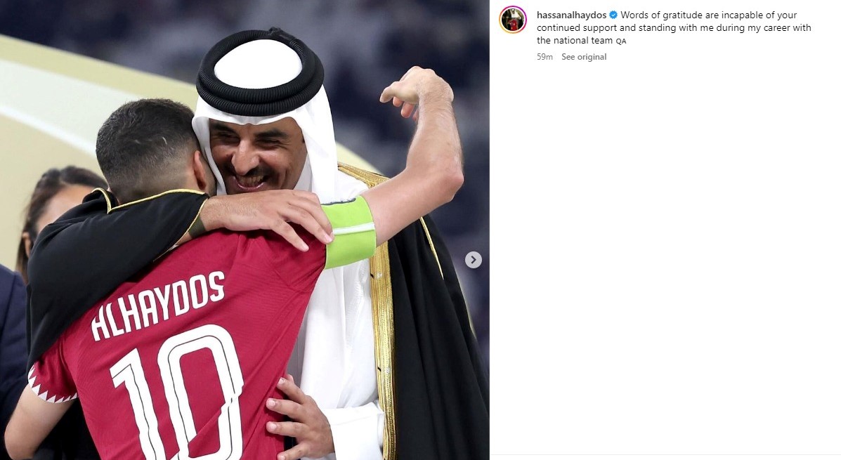For his part, Al Haydos expressed his gratitude towards The Amir HH Sheikh Tamim bin Hamad Al Thani by sharing a photo of himself alongside His Highness, captioned: "Words of thanks fall short in the face of your continuous support and your stand with me throughout my journey with the national team."