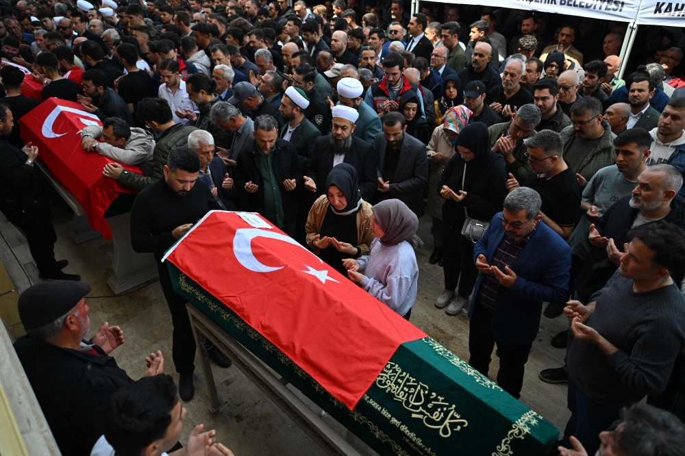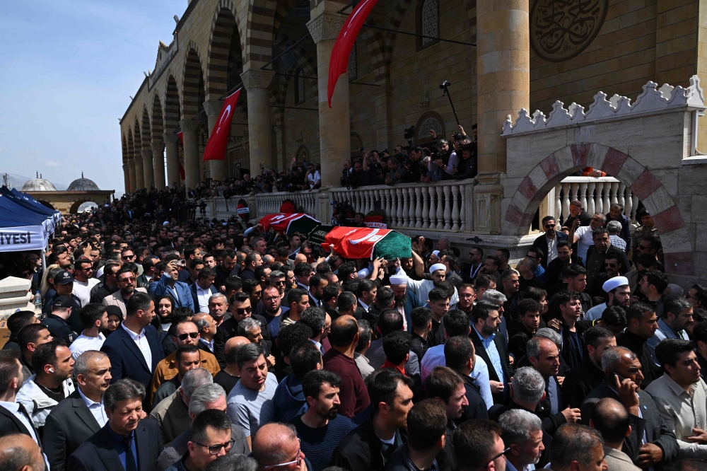 Family members and mourners attend the funerals for nine victims killed in a school shooting at the Abdulhamid Han Mosque in the southern province of Kahramanmaras on April 16, 2026. (Photo by Yasin Akgul / AFP)