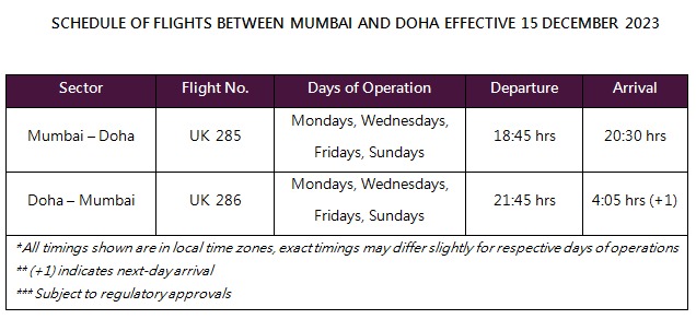 The inaugural flight, operated on Vistara's A321neo aircraft, commenced from Chhatrapati Shivaji Maharaj International Airport, Mumbai, at 18:45 Hours (IST) on 15 December 2023 and arrived at Hamad International Airport, Doha, at 20:30 Hours (local time zone).