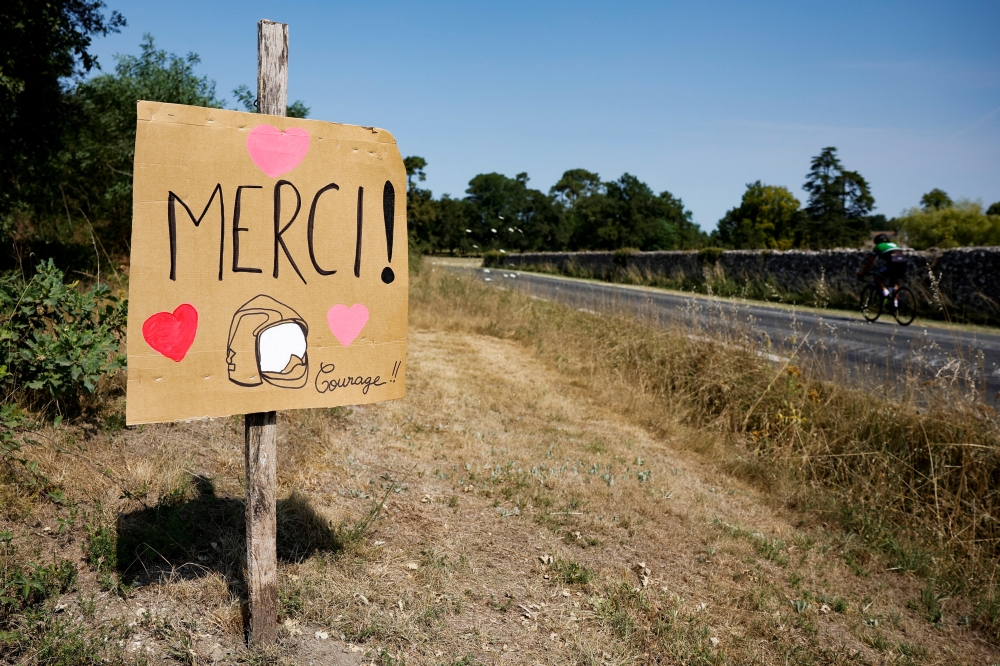 A placard reading "Thanks! Be brave" is seen near Illats, as wildfires continue to spread in the Gironde region of southwestern France, July 17, 2022. (REUTERS/Sarah Meyssonnier)