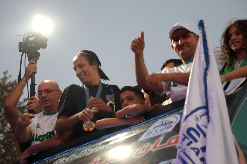 Algerian gold medallist Imane Khelif greets crowds during a bus tour in her hometown city of Tiaret on August 16, 2024. (Photo by AFP)