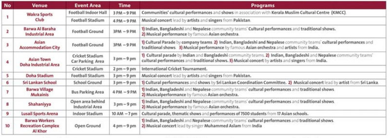 A wide range of cultural events and musical performances will be presented in Wakra Sports Club, Barwa Al Baraha and Asian Accommodation City in Industrial Area, Asian Town, Doha Stadium, Sri Lankan School in Doha, Barwa Village - Mukainis, Shahaniya Industrial Area, Lusail Sports Complex and Al Khor Barwa Workers Recreation Complex.