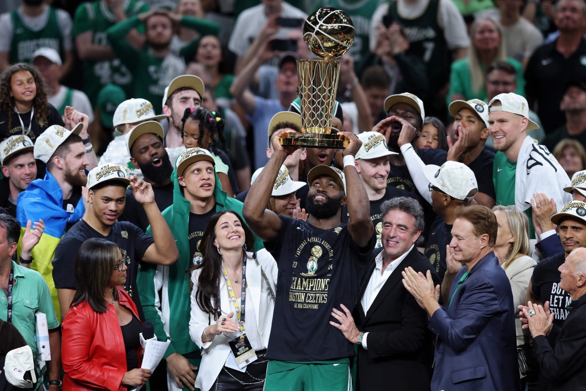 Jaylen Brown of the Boston Celtics holds up the Larry O'Brien trophy after Boston's 106-88 win against the Dallas Mavericks in Game Five of the 2024 NBA Finals at TD Garden on June 17, 2024 in Boston, Massachusetts.(Photo by Adam Glanzman / GETTY IMAGES NORTH AMERICA / Getty Images via AFP)