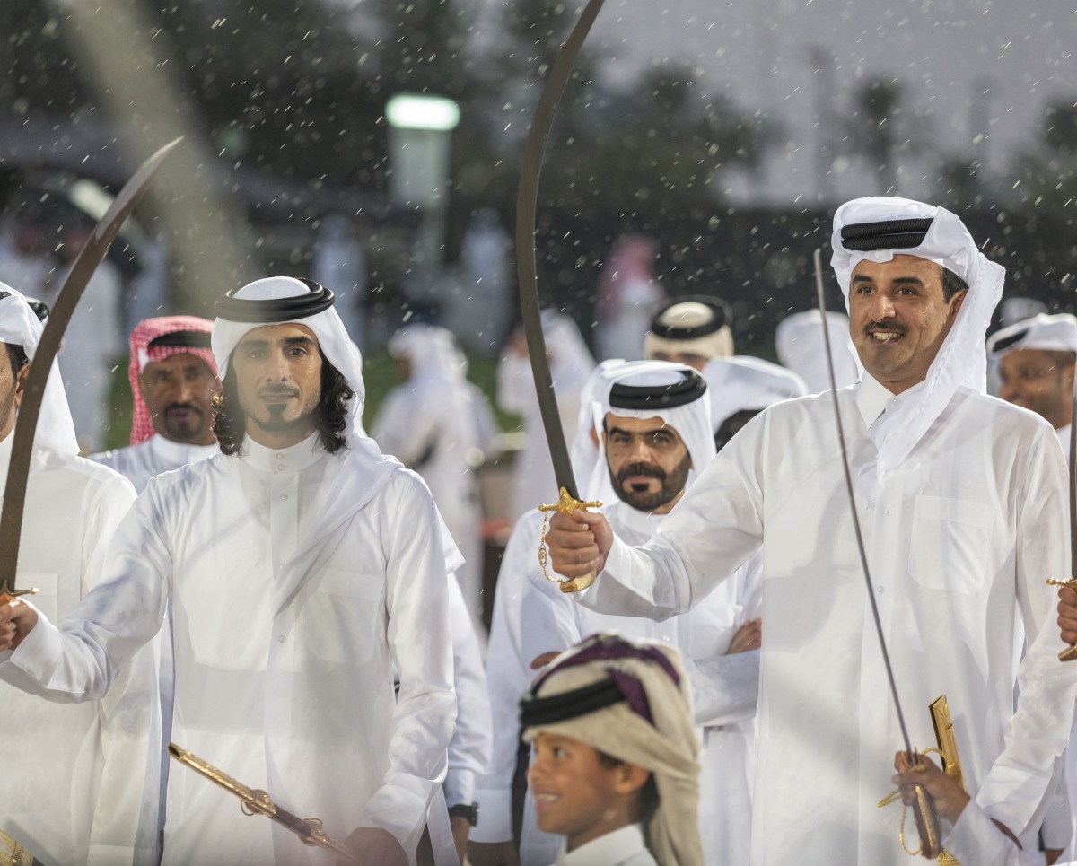 The Amir H H Sheikh Tamim bin Hamad Al-Thani participated yesterday in Qatar's Arda (traditional sword dance), which was held at the Amiri Diwan Yard on Doha Corniche, to celebrate Qatar National Day.