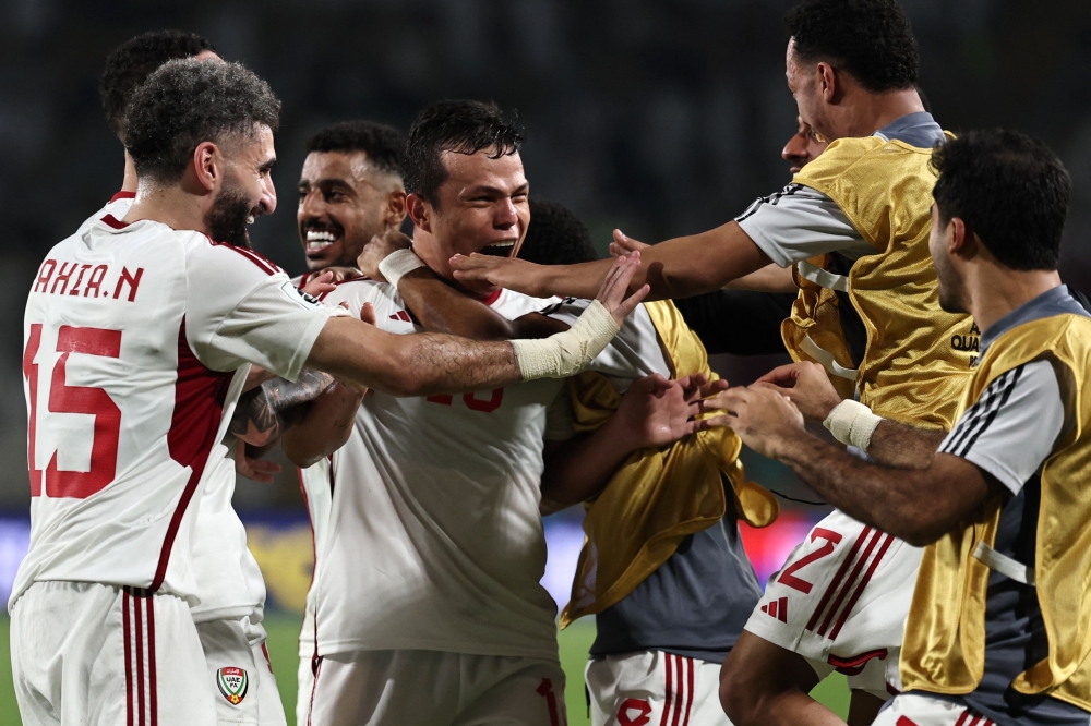 UAE's forward #10 Fabio de Lima celebrates with teammates after scoring his team's second goal during the FIFA World Cup 2026 Asia zone qualifiers group A football match between UAE and Qatar at the Al-Nahyan Stadium in Abu Dhabi on November 19, 2024. (Photo by Fadel Senna / AFP)