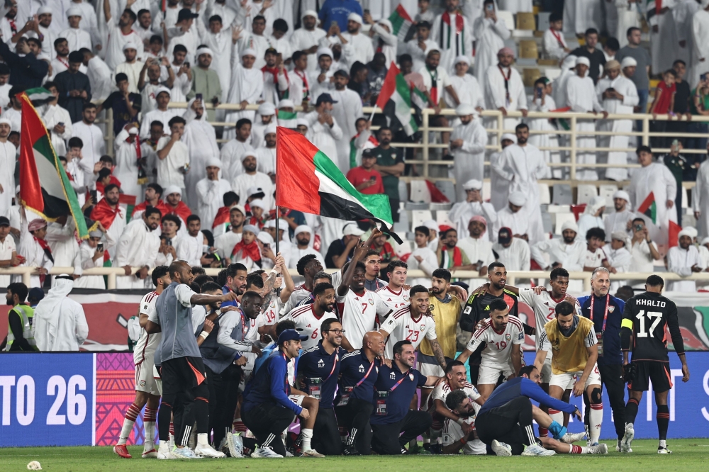 UAE's players pose for a picture with the fans after the FIFA World Cup 2026 Asia zone qualifiers group A football match between UAE and Qatar at the Al-Nahyan Stadium in Abu Dhabi on November 19, 2024. (Photo by Fadel Senna / AFP)