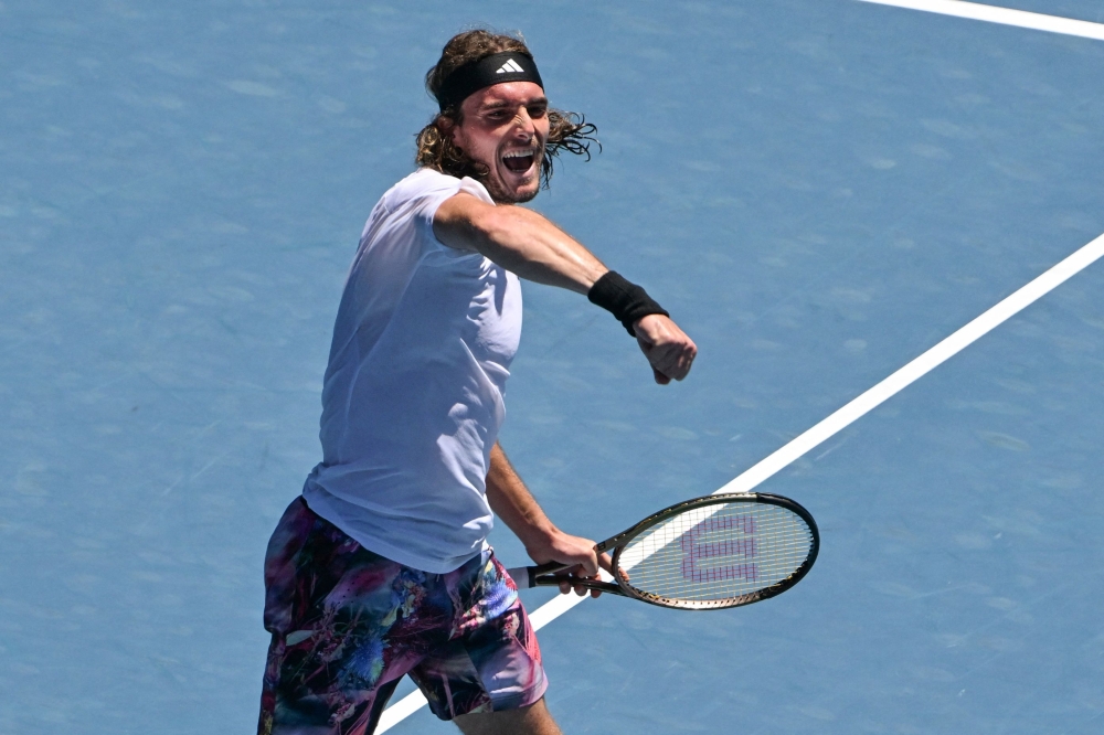 Greece's Stefanos Tsitsipas celebrates after victory against Netherlands' Tallon Griekspoor during their men's singles match on day five of the Australian Open tennis tournament in Melbourne on January 20, 2023. (Photo by Paul Crock / AFP)