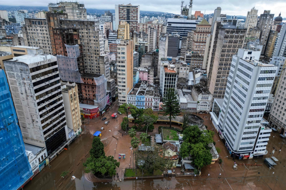 Aerial view of flooded downtown Porto Alegre, Rio Grande do Sul State, Brazil, taken on May 19, 2024. Photo by Nelson ALMEIDA / AFP