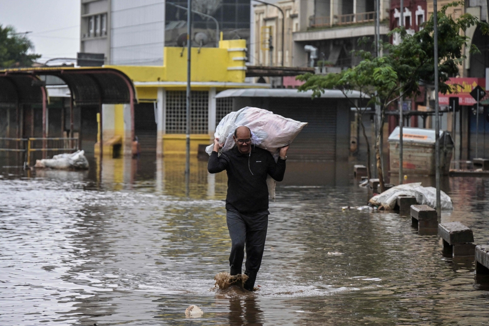 A man walks along a flooded street in downtown Porto Alegre, Rio Grande do Sul State, Brazil, on May 19, 2024. Photo by Nelson ALMEIDA / AFP