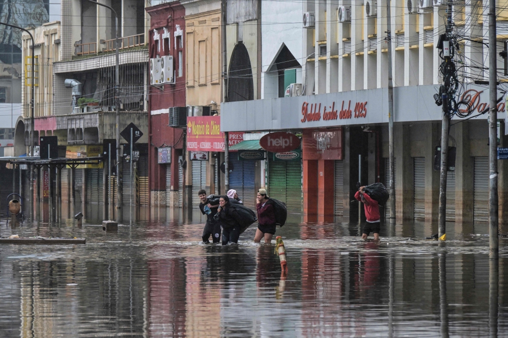 People walk along a flooded street in downtown Porto Alegre, Rio Grande do Sul State, Brazil, on May 19, 2024. Photo by Nelson ALMEIDA / AFP