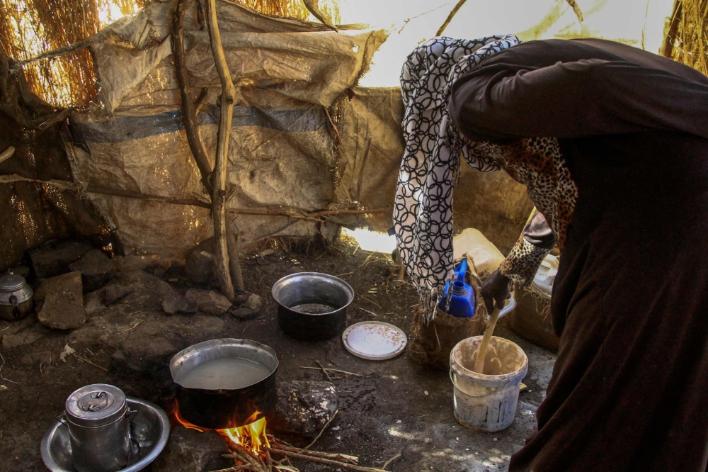 A picture taken on March 20, 2024, shows a displaced woman cooking on woodfire in a tent at a camp in southern Gadaref state for people who fled Khartoum and Jazira states in war-torn Sudan. (Photo by AFP)