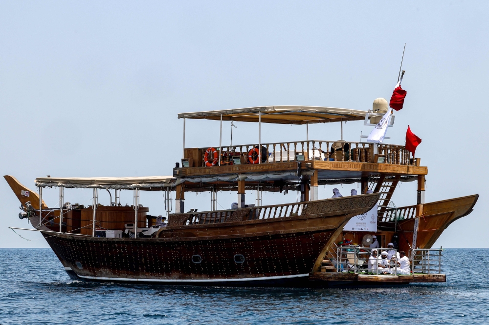 Participants aboard a traditional dhow boat during the hand-line fishing competition of the Senyar Festival off of Sealine south of Doha on April 21, 2025. (Photo by Karim Jaafar / AFP)