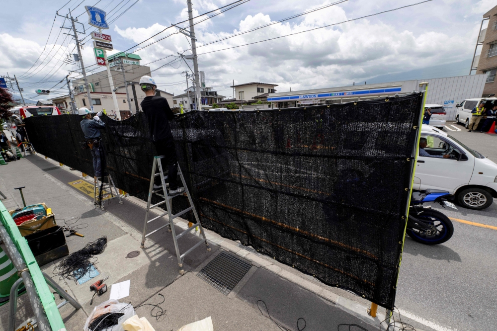 Workers install signage warning pedestrians against running out on the road is seen on the pavement by the entrance of a convenience store parking lot in the town of Fujikawaguchiko, Yamanashi prefecture on May 21, 2024. Photo by Kazuhiro NOGI / AFP