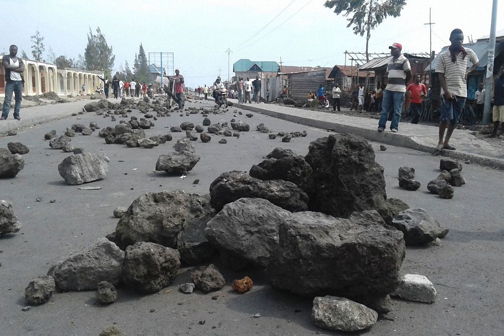 Demonstrators placed rocks to block roads during a protest in Goma on September 19, 2016. At least 17 people, mostly civilians, were killed on September 19, 2016 when clashes erupted ahead of a planned opposition rally in the Congolese capital Kinshasa, a