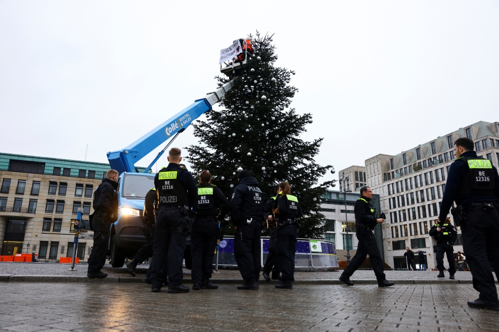 Berlin: German activists chopped off the top of a Christmas tree next to the Brandenburg Gate in Berlin on Wednesday, their latest protest pushing for greater action to combat the climate crisis.