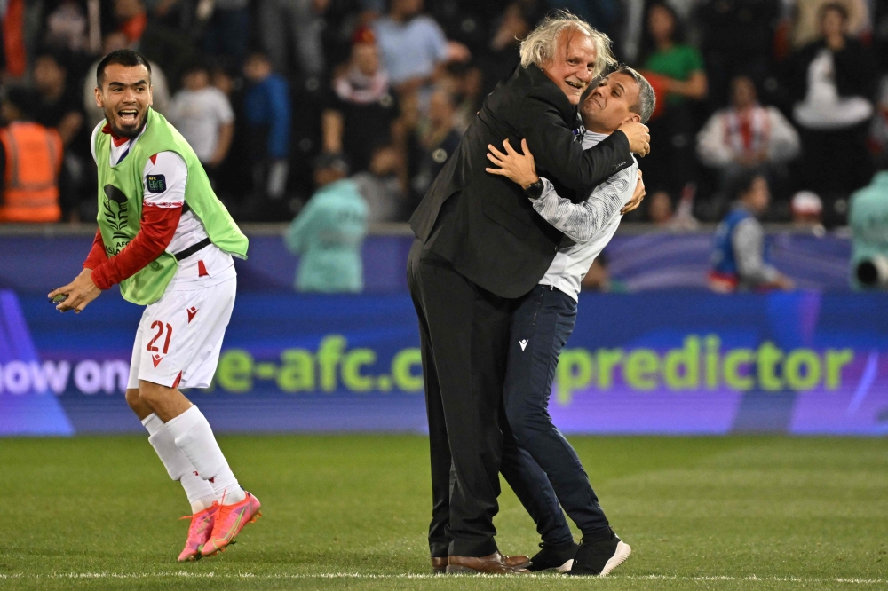 Tajikistan's Croatian coach Petar Segrt celebrates with his assistant after the Qatar 2023 AFC Asian Cup Group A football match between Tajikistan and Lebanon at the Jassim bin Hamad Stadium in Doha on January 22, 2024. (Photo by Hector Retamal / AFP)