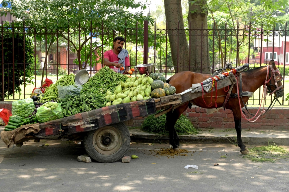 A vendor sells vegetables on a horse-drawn cart during a hot summer day in Amritsar on May 22, 2023. (Photo by Narinder Nanu / AFP)