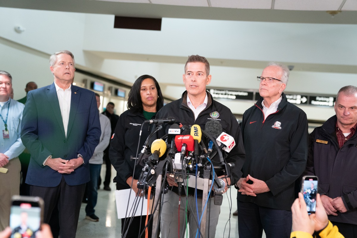 Transportation Secretary Sean P. Duffy speaks after a midair collision between a passenger jet and a military helicopter near Reagan National Airport in January. Photo credit: Allison Robbert/For The Washington Post