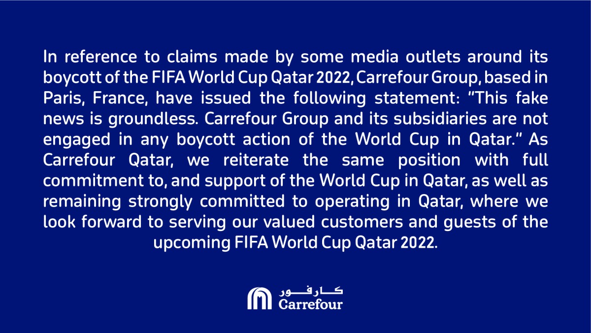 "This fake news is groundless. Carrefour Group and its subsidiaries are not engaged in any boycott action of the World Cup in Qatar,” said Carrefour in an official statement.