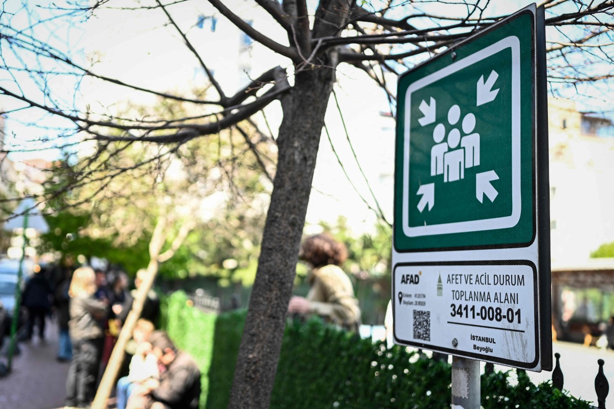 This photograph shows an earthquake assembly area sign in Istanbul on April 23, 2025, following an initial quake at 12:49 pm (0949 GMT) followed by three others of with magnitudes of 4.4 to 4.9. Photo by KEMAL ASLAN / AFP