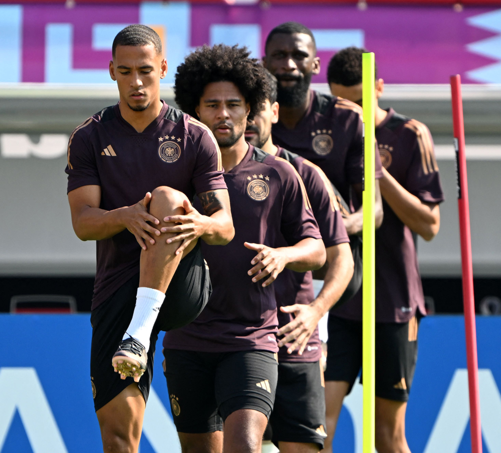 FROM LEFT: Germany’s Thilo Kehrer, Serge Gnabry, Ilkay Gundogan and Antonio Ruediger attend a training session at Al Shamal Stadium yesterday, on the eve of their match against Japan. AFP
